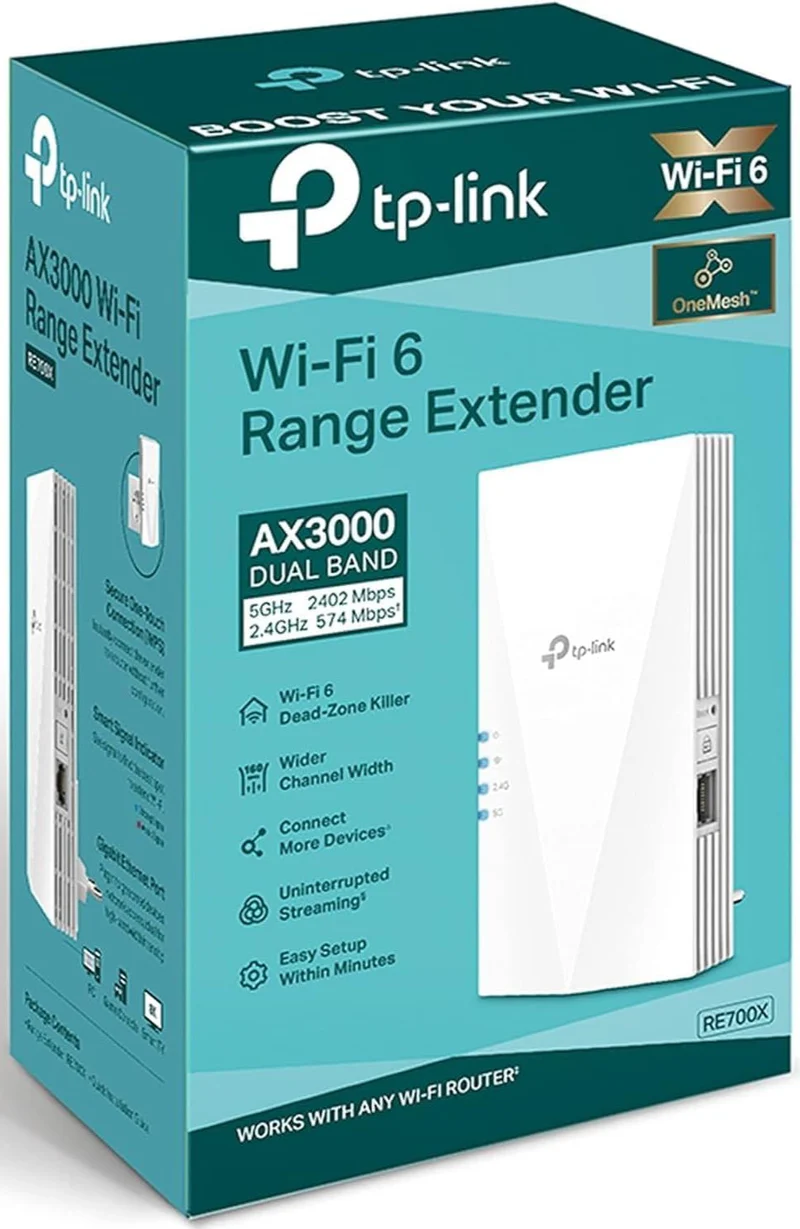 The TP-Link Range Extender RE700X is a high-performance Wi-Fi 6 range extender designed to eliminate dead zones and boost your existing network’s speed and coverage. Equipped with the latest Wi-Fi 6 technology, it delivers faster speeds, higher efficiency, and better capacity to handle multiple devices simultaneously.